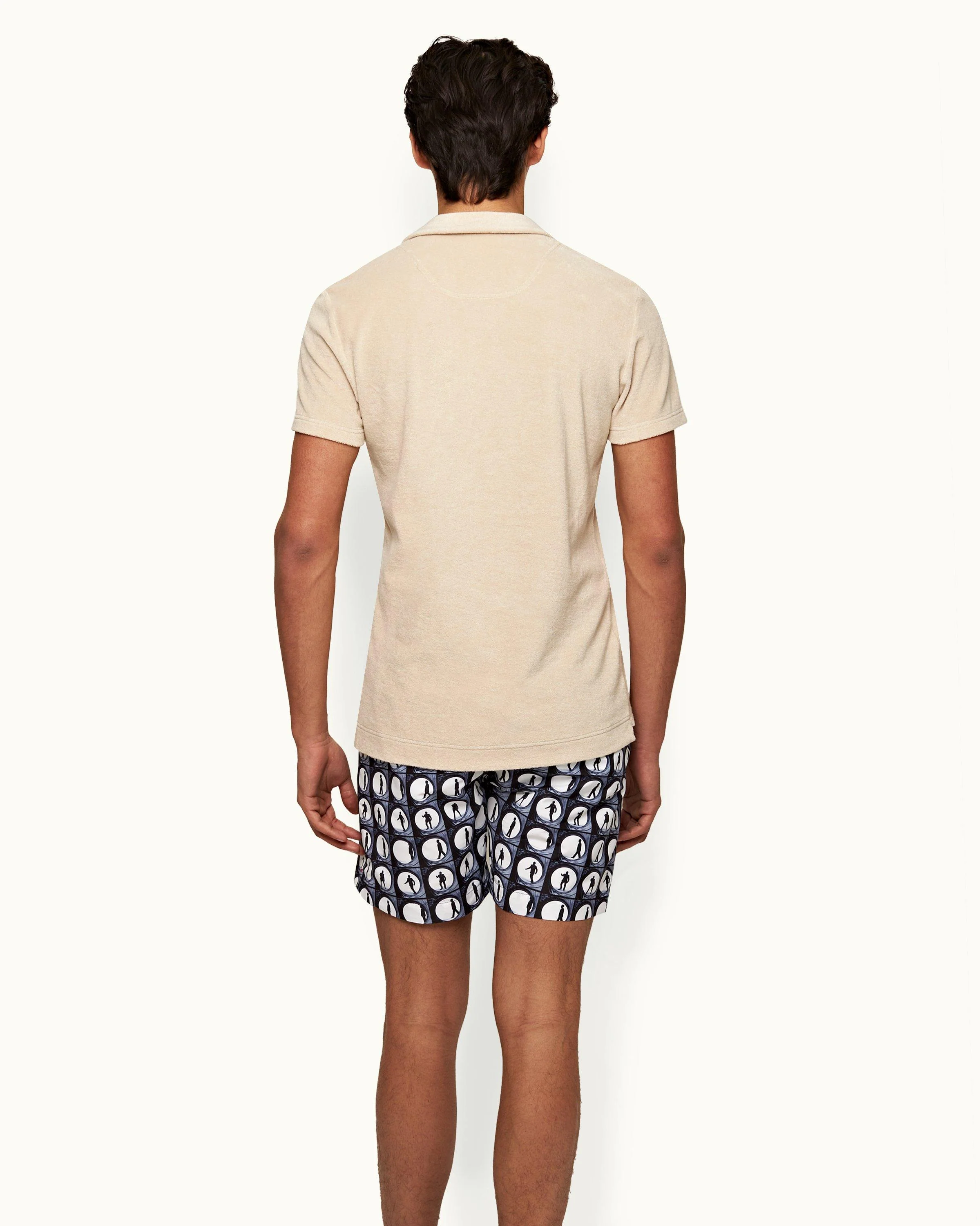 These mid-length men’s swim shorts feature printed snippets of James Bond in the iconic opening credits. The perfect holiday style for true 007 aficionados.