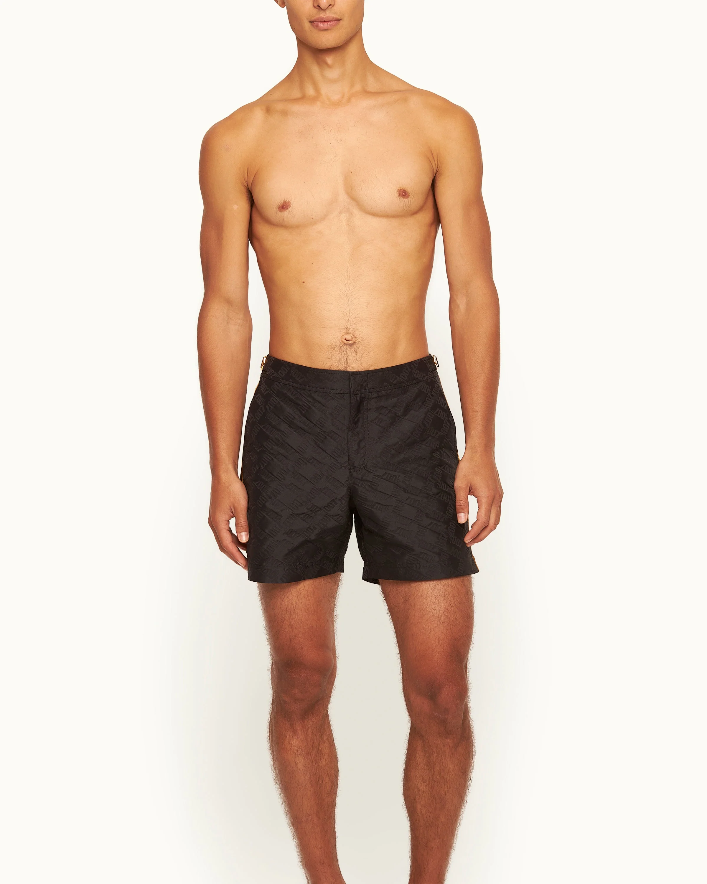 In black with a slick of gold, these Bulldog swim shorts nod to villain Auric Goldfinger's suit in the iconic 'Goldfinger' (1964) laser scene. Repeated within the black jacquard fabric is a tonal '007' logo, and striking gold-tone piping along the side seam.