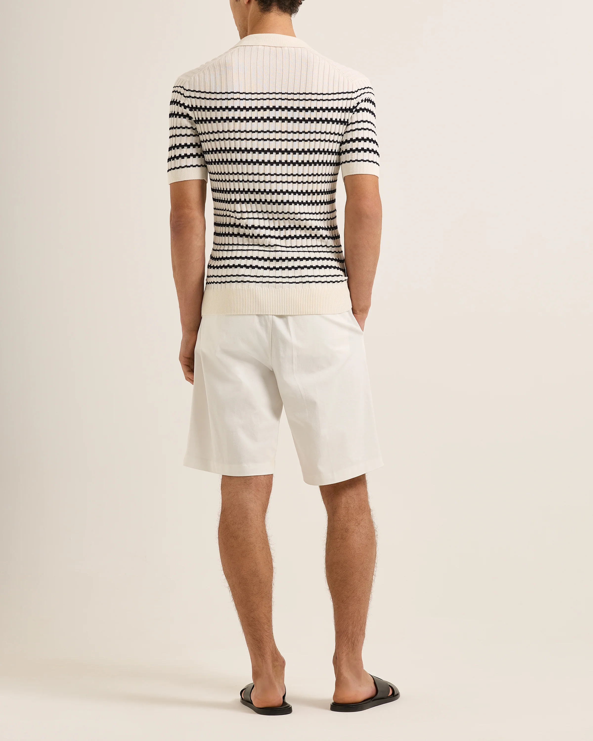 For days that feel unhurried and sun-warmed. The long lunch, the gentle breeze, the easy pleasure of good company. The Canet Stripe Polo is a tailored fit, its ribbed stitch offering light texture that suits warm afternoons and relaxed evenings. An engineered classic stripe brings a touch of understated character, balanced by a short open resort placket that lends the piece an easy, vacation-minded charm. Fully fashioned construction keeps the lines clean and considered, ensuring it sits neatly without ever feeling too formal. In White Sand, the palette stays soft and versatile- a natural companion to the season. Polished yet relaxed, it’s the kind of polo that carries you effortlessly from one good moment to the next. Feel Summer.