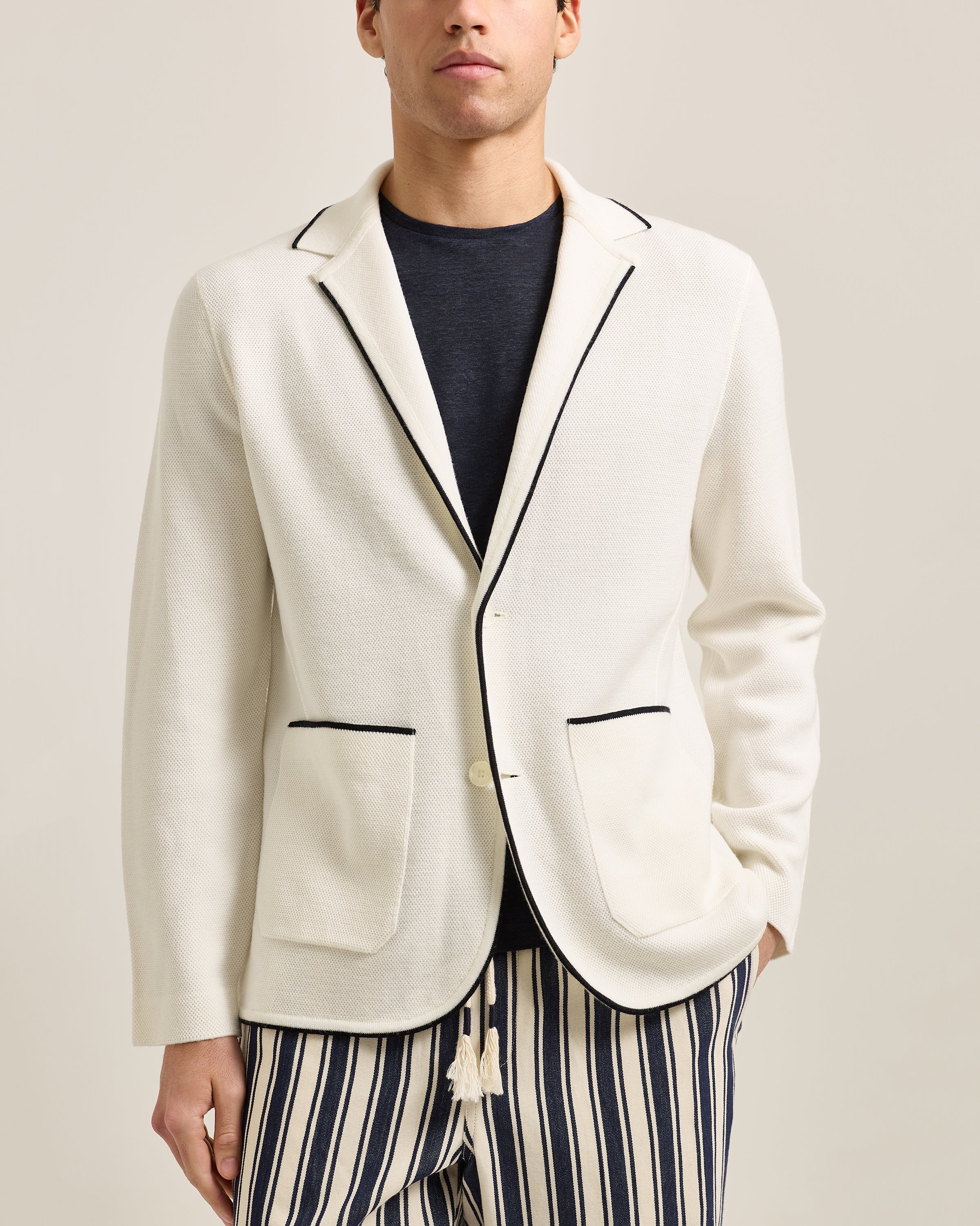 The Rainer Tipping blazer is knitted from 14-gauge piqué-stitched merino wool, spun in Italy for a clean handle and breathable comfort. The tailored silhouette keeps things refined, while the knit construction ensures it never feels stiff or overworked. Finished in crisp white with navy tipping along the collar, lapels and pocket openings, it’s a subtle flourish that nods to classic Riviera style - elegant, relaxed, and quietly confident. Notch lapels, a single vent, and patch pockets complete the picture. Equally at ease with tailored trousers or poolside stripes, this is summer tailoring at its most effortless. Feel Summer.